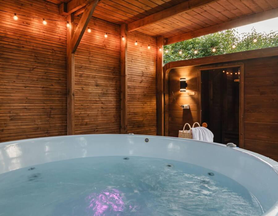 Ukryte wśród zieleni ogrodowe SPA to wyjątkowa drewniana konstrukcja z sauną fińską oraz jacuzzi w formie balii. Idealne miejsce na wieczorny relaks w jacuzzi pod gwiazdami w ciepłe letnie wieczory lub na rozgrzewający seans saunowy w chłodne dni.